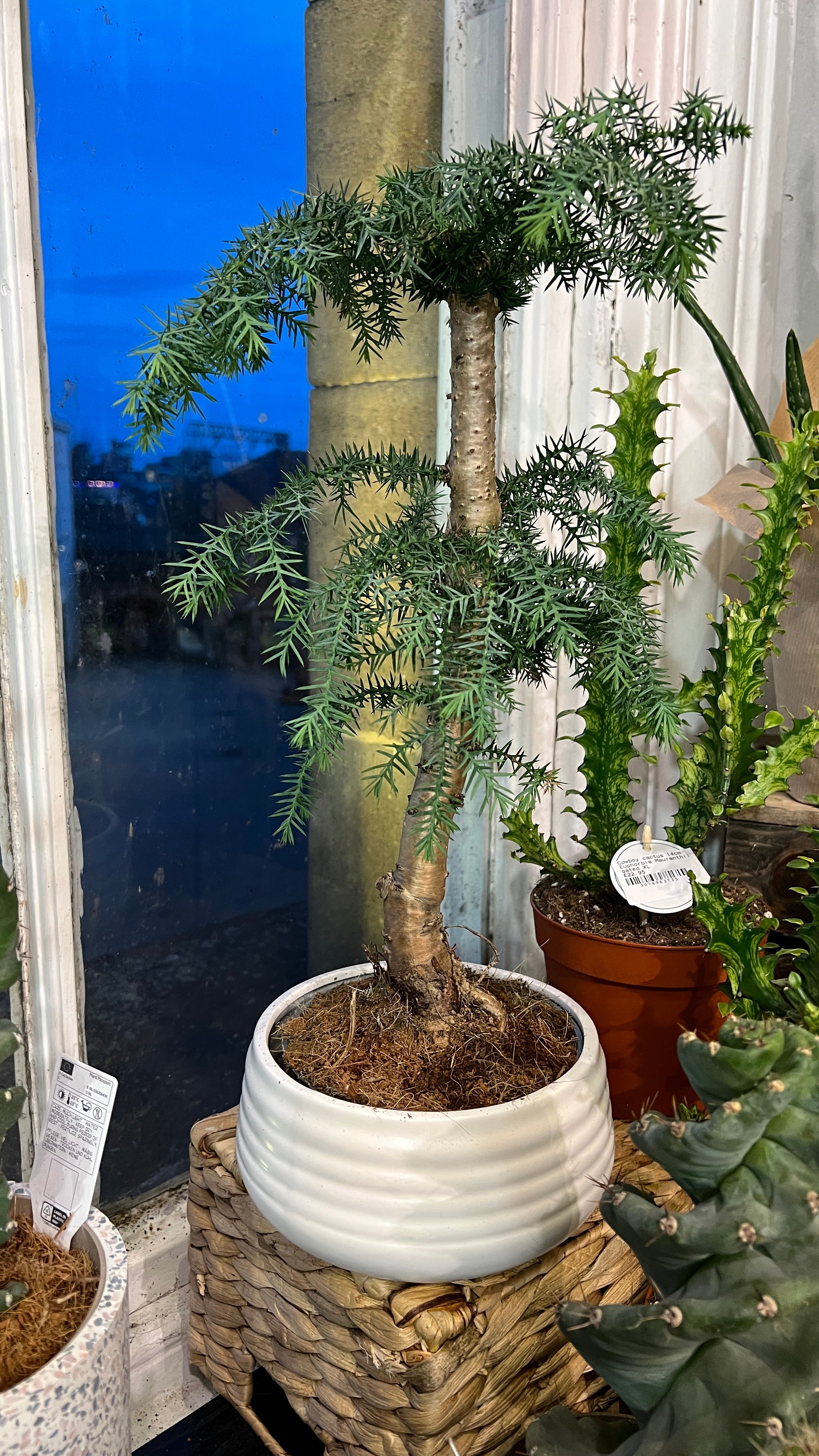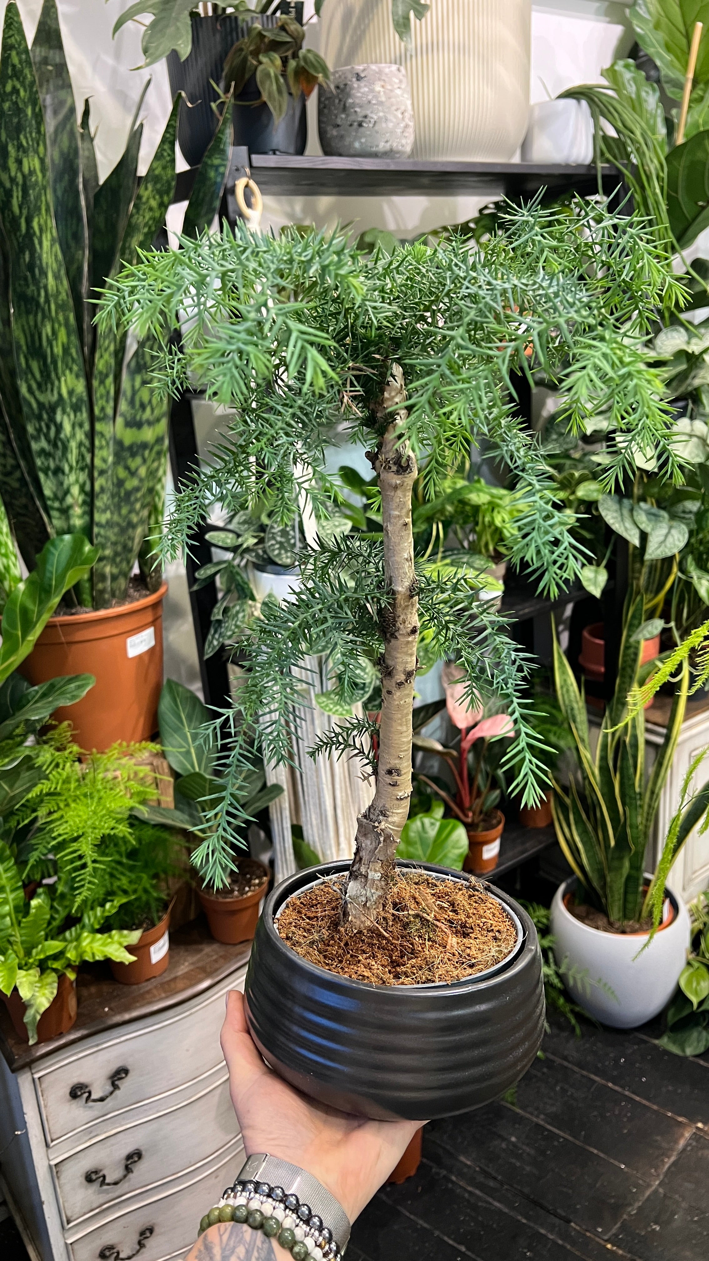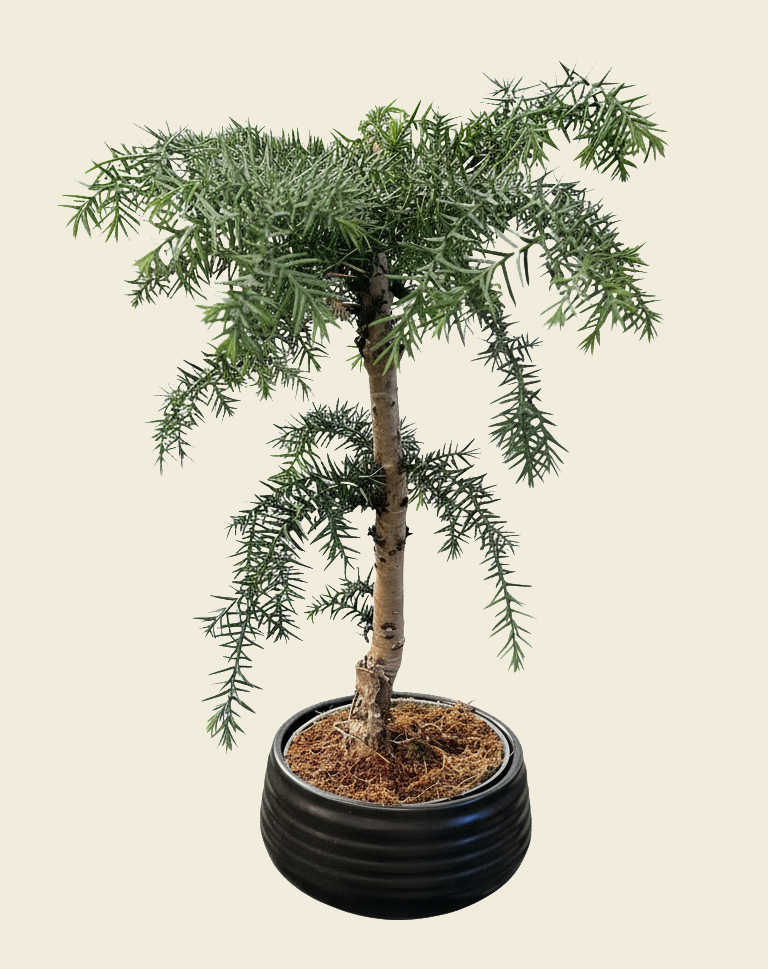 Araucaria cunninghamii is an unusual and elegant bonsai tree with soft, symmetrical needle-like foliage arranged in neat tiers along upright branches. Commonly known as the Hoop Pine, this species brings a calm, sculptural presence that suits minimalist and contemporary interiors. As a bonsai, it offers a refined alternative to traditional styles, with a naturally balanced form that looks architectural yet gentle. Its evergreen nature ensures year-round visual interest, making it a distinctive living feature for indoor spaces.