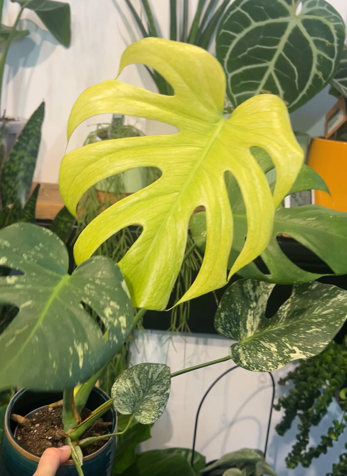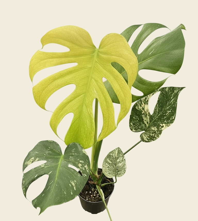 Water your Monstera Mint when the top third of the soil feels dry. Provide a thorough watering until excess drains out of the pot, but ensure the plant is not left sitting in water to prevent root rot. Due to its variegation, this plant is more sensitive to overwatering, so moderation is key.